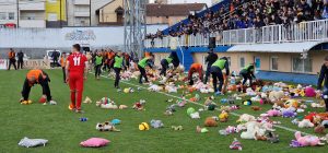 فٹ بال کلب نووی پزار اور رڈنیکی کے شائقین نے ترکیہ میں گزشتہ ماہ آنے والے تباہ کن زلزلوں سے متاثرہ بچوں کے ساتھ اظہار یکجہتی کے لیے کھلونے میدان میں پھینکے۔