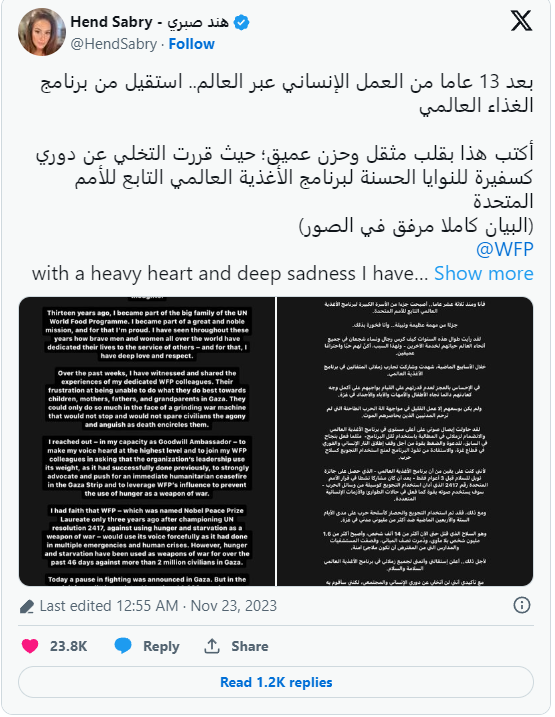 طویل ناکہ بندی سے گزرنے والے غزہ میں خوراک اور پانی تک سے محروم فلسطینیوں کے لیے خوراک کے عالمی ادارے ورلڈ فوڈ پروگرام کی حالت بھی ایسی پتلی رہی ہے کہ اس کی خیر سگالی کی سفیر ہیند صابری نے احتجاجاً استعفیٰ دے دیا ہے۔ خیر سگالی کی سفیر کے مطابق ورلڈ فوڈ پروگرام کا دوسرے ملکوں اور علاقوں میں جنگی یا بحرانی صورت حال میں تو کردار خوب فعال ہوتا تھا مگر غزہ کے حوالے سے اس کی رفتار اور دلچسپی دونوں ہی اچھی نہیں رہی ہیں۔