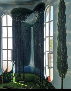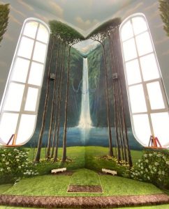 اندرونی حصے میں محراب پر آبشار بنائی گئی ہے۔ کھڑکیوں اور دیواروں پر مرکزی اناطولیہ کے درخت بنائے گئے ہیں جیسے صنوبر کے درخت جو کہ اناطولیہ کی اہم علامت سمجھے جاتے ہیں۔ اور انگور کی بیلیں چونکہ اناطولیہ میں بیل دار درختوں کا کافی رواج ہے اس لئے انگور کے باغات کی تشبیہ جو جنت سے میل کھاتی ہے وہ تصور یہاں بھی لاگو کیا گیا ہے۔ فرش کو گھاس والی ہری بھری دکھایا گیا ہے بادلوں سے پانی اتارنا دکھایا گیا ہے۔ اس مسجد کا تصور کریں تو لگتا ہے گویا انسان جنت میں نماز ادا کر رہا ہو.