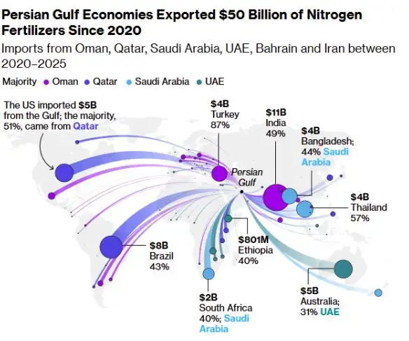 - بلومبرگ (Bloomberg) کی رپورٹ کے مطابق سال 2020 سے 2025 کے دوران عمان، قطر، سعودی عرب، متحدہ عرب امارات، بحرین اور ایران نے مل کر تقریباً 50 ارب ڈالر مالیت کی نائٹروجن کھادیں برآمد کی ہیں۔