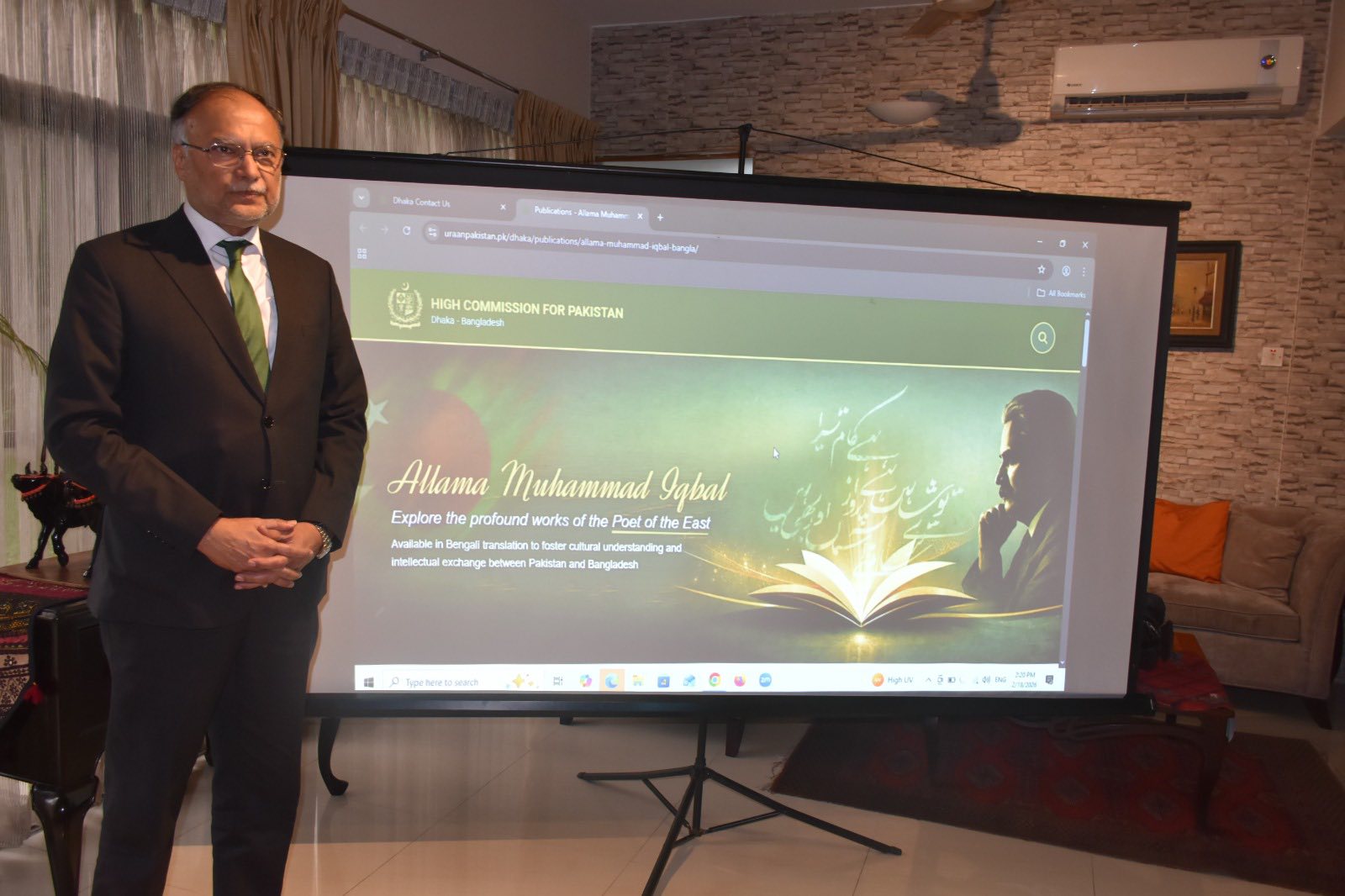 ڈھاکہ میں وفاقی وزیر برائے منصوبہ بندی، ترقی و خصوصی اقدامات پروفیسر احسن اقبال نے پاکستان ہائی کمیشن کی ویب سائٹ پر علامہ محمد اقبال کی بنگالی زبان میں ترجمہ شدہ 40 تصانیف کا اجراء کیا۔ تقریب کے دوران انہوں نے بنگلہ دیش میں زیرِ تعلیم پاکستانی طلبہ سے ملاقات کی اور کہا کہ علامہ اقبال کا وژن اور فلسفہ، خصوصاً تصورِ ’’خودی‘‘، برصغیر سمیت دنیا بھر میں لوگوں کے لیے آج بھی باعثِ تحریک ہے۔