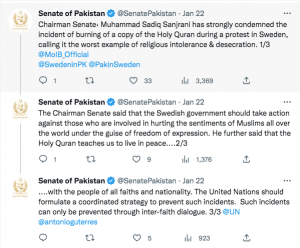 چیئرمین سینیٹ محمد صادق سنجرانی نے سویڈن میں ایک احتجاجی مظاہرے کے دوران مسلمانوں کی مقدس کتاب قرآن پاک کے نسخے کو نذرآتش کرنے کے واقع کی شدید مذمت کرتے ہوئے اسے مذہبی عدم برداشت اور بے حرمتی کی بد ترین مثال قرار دیا ہے۔ چیئرمین سینیٹ نے کہا کہ سویڈش حکومت آزادی اظہارِ رائے کی آڑ میں پوری دنیا کے مسلمانوں کے جذبات کو مجروح کرنے والوں کے خلاف کارروائی کرے۔
