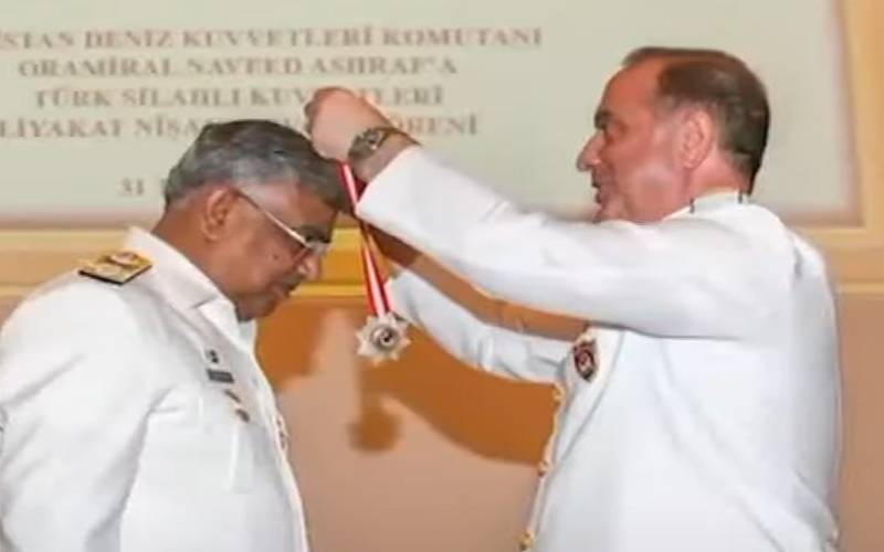 راولپنڈی — (آئی ایس پی آر) — پاک بحریہ کے سربراہ ایڈمرل نوید اشرف کو ترکیہ کے سرکاری دورے کے دوران اعلیٰ عسکری اعزاز "لیجن آف میرٹ آف دی ترک آرمڈ فورسز” سے نوازا گیا۔ یہ اعزاز ترک نیول فورسز کے ہیڈکوارٹرز میں ایک پروقار تقریب کے دوران دیا گیا، جہاں ان کے اعزاز میں گارڈ آف آنر بھی پیش کیا گیا۔ایڈمرل نوید اشرف نے ترک نیول فورسز کے کمانڈر سمیت ترک وزیر دفاع، چیف آف جنرل اسٹاف اور کمانڈر ترکش نیوی فلیٹ سے الگ الگ ملاقاتیں کیں۔ ان ملاقاتوں میں دوطرفہ بحری تعاون، علاقائی میری ٹائم سیکیورٹی، دفاعی شراکت داری، مشترکہ مشقوں اور تربیتی صلاحیتوں کے فروغ پر تفصیلی تبادلہ خیال کیا گیا۔دورے کے دوران سربراہ پاک بحریہ نے استنبول نیول شپ یارڈ میں ملجم پراجیکٹ کا جائزہ لیا، گولچک نیول بیس کا دورہ کیا اور آبدوزوں کی تعمیراتی صلاحیتوں کا معائنہ کیا۔ انہوں نے ترکش نیول فلیٹ کے متعدد جہازوں اور نیول تنصیبات کا بھی دورہ کیا اور مصطفیٰ کمال اتاترک کے مزار پر پھول چڑھائے۔ترکیہ کا یہ دورہ دونوں برادر ممالک کے درمیان بحری تعاون کو مزید وسعت دینے اور دفاعی تعلقات کو نئی جہت دینے کا باعث بنے گا۔