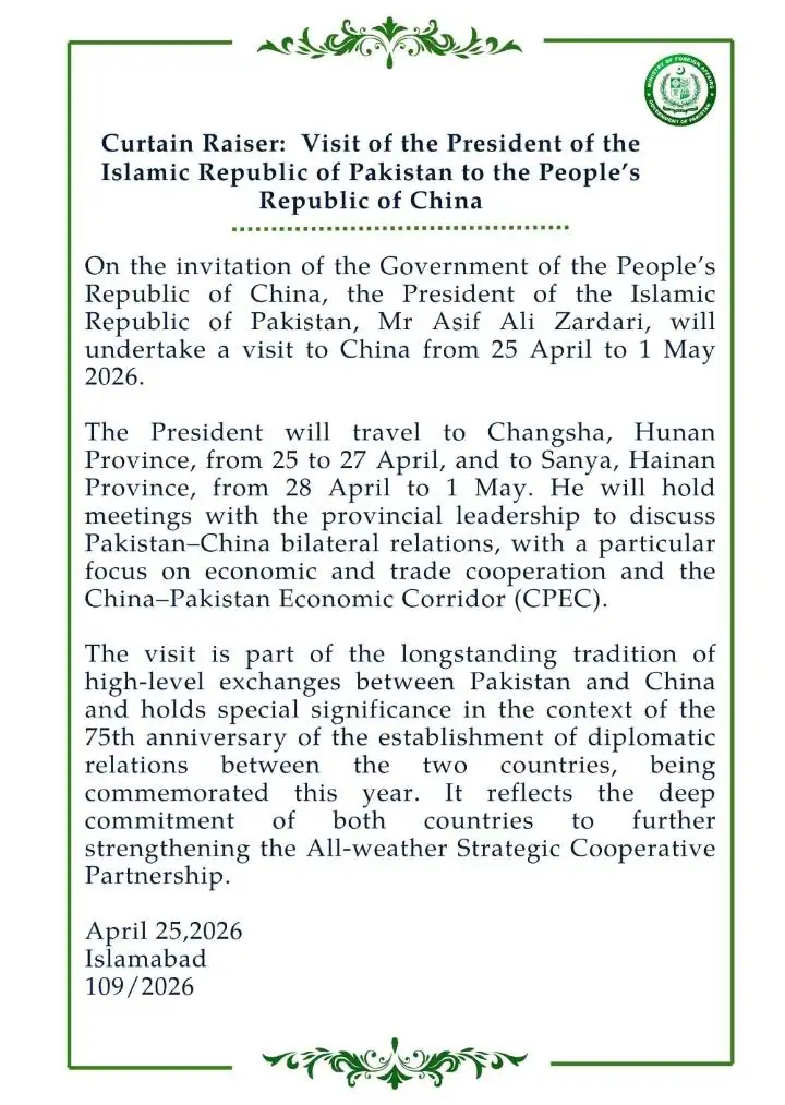 اسلام آباد (25 اپریل 2026): صدرِ مملکت آصف علی زرداری چینی حکومت کی خصوصی دعوت پر آج سے یکم مئی تک چین کے 7 روزہ سرکاری دورے پر روانہ ہو گئے ہیں۔ دفترِ خارجہ کے مطابق یہ تاریخی دورہ پاکستان اور چین کے سفارتی تعلقات کے قیام کی 75ویں سالگرہ (پلاٹینم جوبلی) کے پرمسرت موقع پر ہو رہا ہے، جسے دونوں ممالک کے درمیان اسٹریٹجک اعتماد کی تجدید قرار دیا جا رہا ہے۔