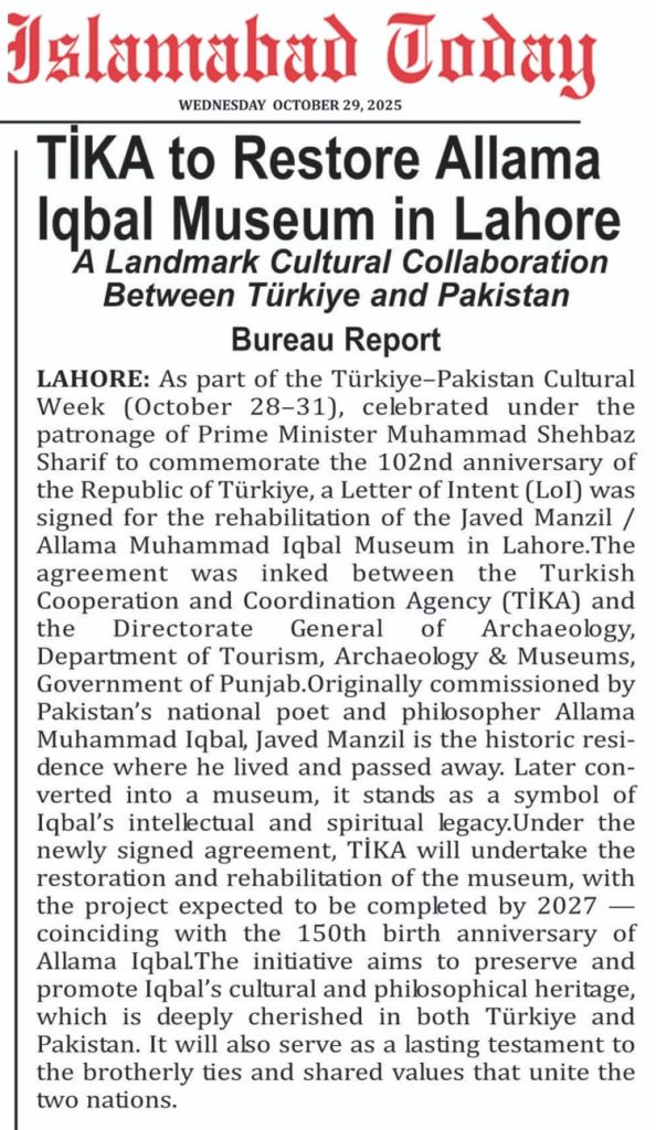 اسلام آباد — پاکستان کے قومی میڈیا نے ترک تعاون و رابطہ ایجنسی (TİKA) کے اس اہم منصوبے کو نمایاں طور پر اجاگر کیا ہے جس کے تحت علامہ محمد اقبالؒ کے تاریخی گھر “جاوید منزل” کی بحالی اور تزئین و آرائش کا کام جاری ہے۔