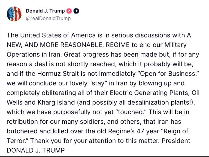 مذاکرات میں پیش رفت ہو رہی ہے، تاہم اگر جلد کسی معاہدے تک نہ پہنچا گیا اور آبنائے ہرمز بحال نہ ہوئی تو امریکہ ایران میں تیل کی تنصیبات، بجلی کے مراکز، خارگ جزیرے اور پانی صاف کرنے والے پلانٹس کو نشانہ بنانے پر غور کر سکتا ہے