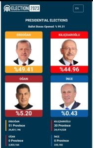 صدارتی اور پارلیمانی انتخابات کے بعد گنتی کا عمل 99 فیصد مکمل ہو گیا ہے ، صدارتی امیدوار رجب طیب ایردوان اور کمال کلچدار اولو کے درمیان سخت مقابلہ ہوا ۔ غیر حتمی نتائج کے مطابق 99 فیصد رزلٹ میں صدر ایردوآن 49.41 فیصد ووٹ حاصل کئے ہیں ان کو پچاس فیصد ووٹوں کا ہدف مکمل کرنے کے لئے مزید عشاریہ.60% ووٹوں کی ضرورت ہے۔ جبکہ ان کے مخالف امیدوار کمال کلچدار اولو 44.96 فیصد ووٹ حاصل کر سکے جبکہ تیسرے امیدوار سنان اوغان صرف 5.20 فیصد ووٹ حاصل کر سکے