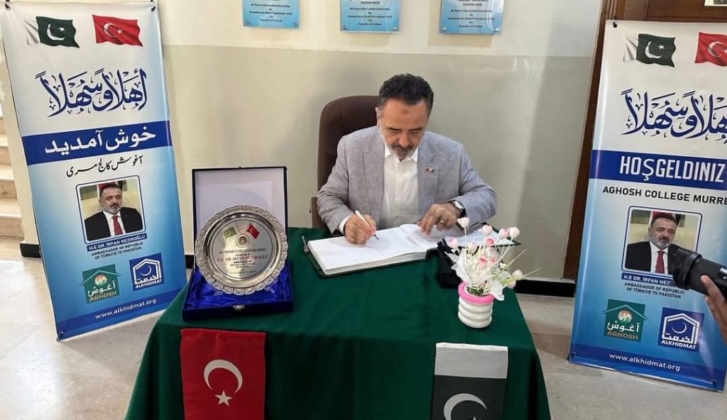 The Ambassador of the Republic of Türkiye to Pakistan, Dr. Mehmet Irfan Nezıroğlu, visited Alkhidmat Foundation’s Aghosh College Murree, where students warmly welcomed him and presented a bouquet of flowers.