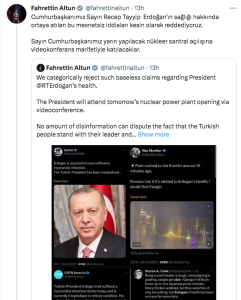 صدر کے اطلاعاتی امور کے ڈائریکٹر فخر الدین آلتون نے بھی اپنے سوشل میڈیا اکاؤنٹ پر صدرایردوان کی صحت کے بارے میں بیان جاری کرتے ہوئے کہا ہے کہ صدر ایردوان کی صحت کے بارے میں غیر ملکی میڈیا اداروں میں دی جانے والی خبریں درست نہیں ہیں، صدر ایردوان بلکل ٹھیک ہیں۔انکا کہنا تھا کہ مختلف سوشل میڈیا اکاؤنٹس پر صدر ایردوان کے دل کا دورہ پڑنے اور انہیں ہسپتال منتقل کیے جانے کی بے بنیاد خبریں گردش کر رہی ہیں جو حقیقت پر مبنی نہیں ہیں اور وہ انہیں مسترد کرتے ہیں۔