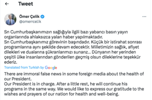 جسٹس اینڈ ڈویلپمنٹ پارٹی کے ترجمان عمر چیلک نے اپنے سوشل میڈیا اکاؤنٹ پر بیان جاری کرتے ہوئے کہا کہ صدر ایردوان کے بارے میں متعدد غیر ملکی میڈیا میں غیر اخلاقی اور بے بنیاد خبریں چلائی گئی ہیں۔ صدر ایردوان اپنے امور انجام دے رہے ہیں۔انہوں نے کہا کہ صدر ایردوان ڈاکٹروں کے مشورے پر آرام کرنے کے بعد معمول کے مطابق اپنا کام شروع کردیں گے۔